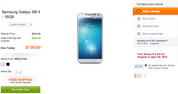 Samsung Galaxy S4 Up For Preorder On AT&T; To Ship On 30th April